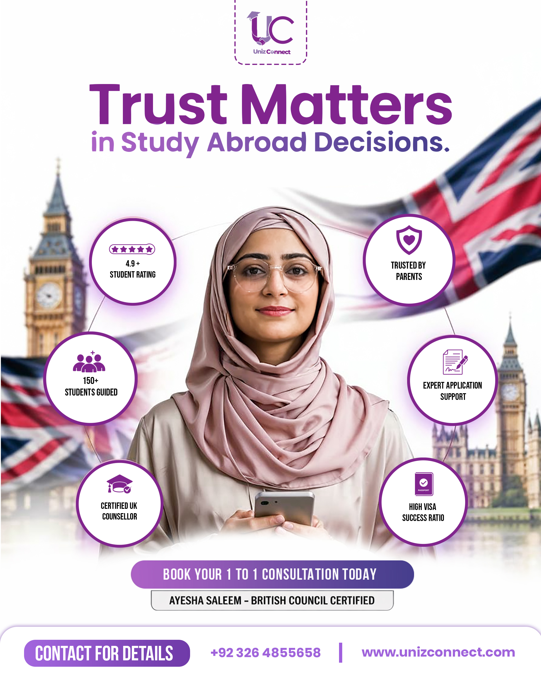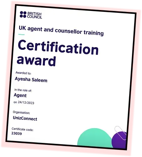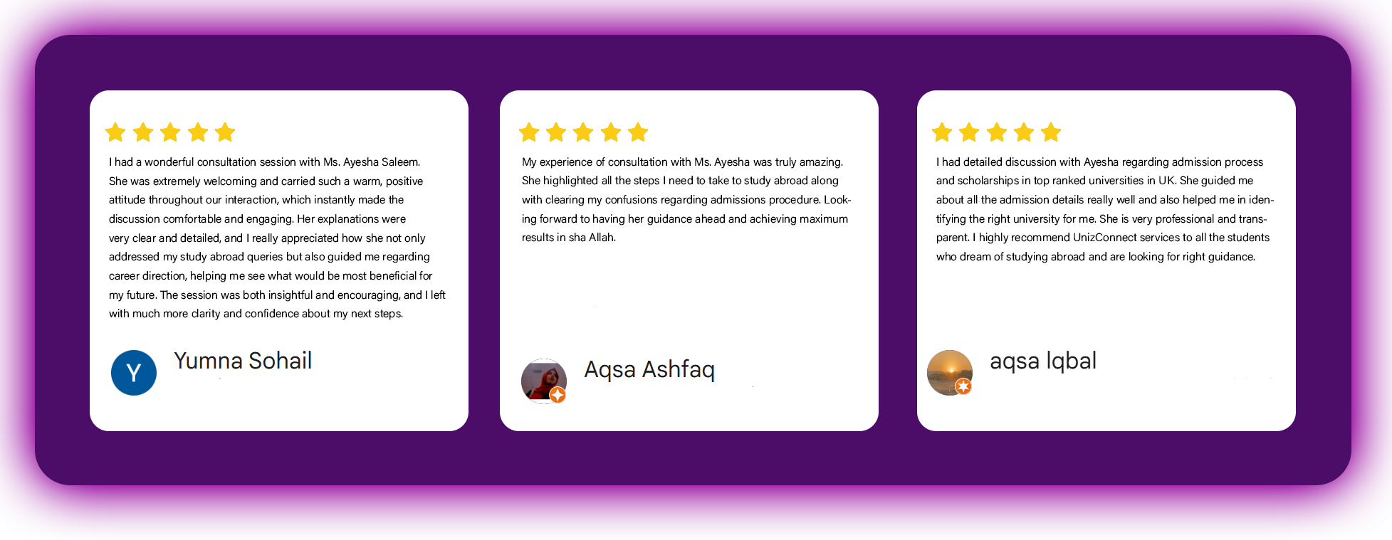 I was ready to pay full fee for a UK master’s because I thought scholarships were not for me. In one 45 minute call, Ayesha fixed my course and country choice and showed me real scholarship options I had completely missed - AHMED MALIK